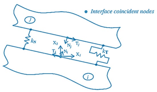 More precisely, by considering the local reference structure of Figure 9, by stating the normal and tangential components of the interface displacement (mechanical) jumps, and , the spring model is implemented as a purpose of the normal and tangential components of the nodal mechanical traction components: