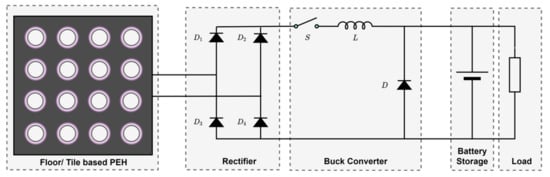A typical floor or tile embedded PEH system [] is shown in Figure 10, in which stress is exerted on the piezoelectric transducers attached to the tiles when a person walks on them. Kamboj et al. [] proposed a footstep energy harvesting system using piezoelectric transducers. The generated energy was converted to the 220 V alternating voltage. Elhalwagy et al. [] presented the feasibility analysis of PEH embedded in the floor tiles in the interiors of a building. The authors concluded that electrical power could be generated from a few microwatts to a few watts per step using floor tile-based PEH’s, depending upon the piezoelectric technology, pedestrian frequency, and area. Table 3 presents various piezoelectric technologies and generated energy.