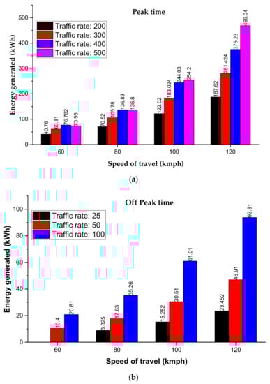 where , , , and are vertical stress on the pavement, effective load area, number of PZT piles in a harvester, and area of PZT, respectively. Najini et al. [] performed the techno-economic analysis of piezoelectric energy generation from vehicle traffic under different traffic conditions in Dubai, as shown in Figure 12.