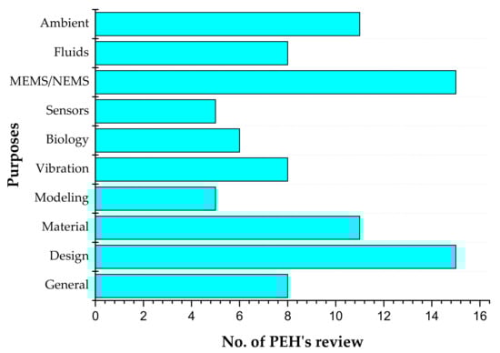 Safaei et al. [] presented a comprehensive review of energy harvesting using piezoelectric materials from 2008 to 2018. The authors discussed various piezoelectric materials, their properties, various piezoelectric energy harvesting methods and designs, energy conditioning circuits, their energy generation capability, and the applications of PEH’s. The authors comprehensibly discussed various PEH’s such as piezoelectric beam harvesters, piezoelectric transducer configurations, nonlinear and broadband piezoelectric harvester designs, piezoelectric-MEMS energy harvesting designs, energy harvesters based on meta-material and meta-structure, windmill-style PEH’s, flutter-style PEH’s, piezoelectric devices for liquid flow energy harvesting, wearable PEH’s, implantable PEH’s, PEH’s from animals, PEH designed for infrastructure, PEH designs for energy harvesting from vehicles, multifunctional piezoelectric energy harvesting systems, multi-source energy harvesters, and alternative PEH’s.