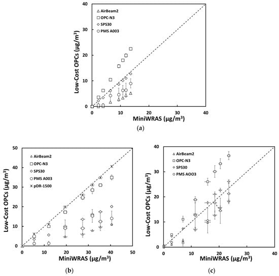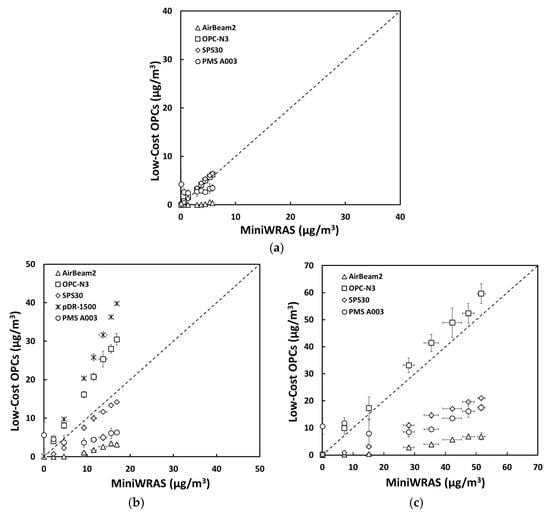 The mass concentrations (µg/m3) of (a) PM1, (b) PM2.5mc, and (c) PM10 reported by the sensors plotted against the reference device for the PAO-4 oil environmental experiment.