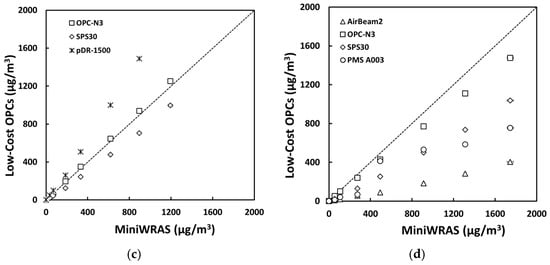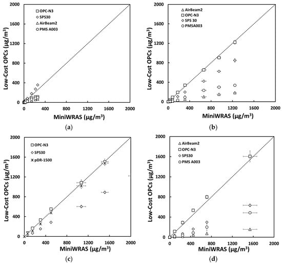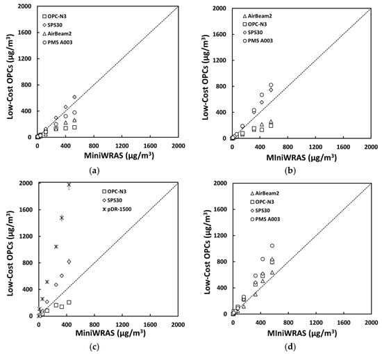 The mass concentrations (µg/m3) of (a) PM1, (b) PM2.5, (c) PM4mc, and (d) PM10 reported by the sensors plotted against the reference device for the PAO-4 oil occupational experiment.