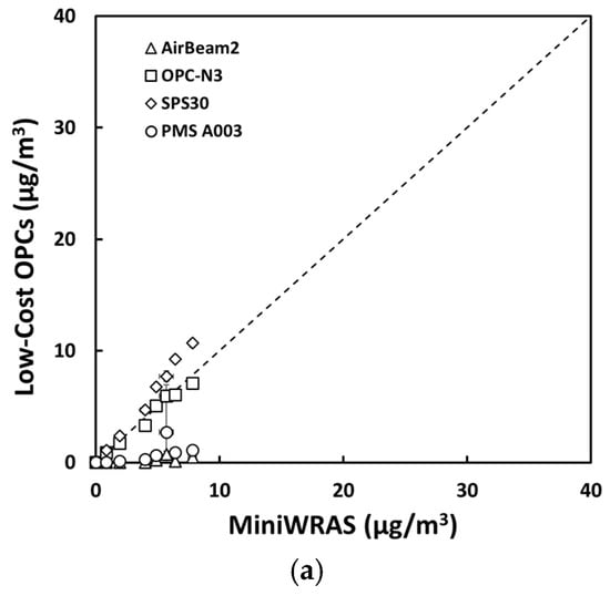 Recently, there has been an increase in the use of low-cost PM sensors to monitor health hazards, especially in developed countries []. These devices are easy to operate, portable, compact in size, and relatively inexpensive. Optical particle counters (OPCs) are the most widely used devices for counting and sizing particles ranging from 0.25 µm to several microns. OPCs measure the amount of light scattered by individual particles as they navigate through a beam of light. A fraction of the scattered light is collected and directed to a photodetector, where it is converted to a voltage pulse []. The particle size is then determined from the magnitude of this voltage pulse using a calibration curve. Several studies have been conducted to evaluate the performance of low-cost sensors in laboratory and field settings; however, the results have been somewhat mixed depending on the type of sensor used [,,,,,].