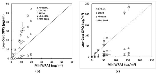 The mass concentrations (µg/m3) of (a) PM1, (b) PM2.5mc, and (c) PM10 reported by the sensors plotted against the reference device for the ARD environmental experiment.