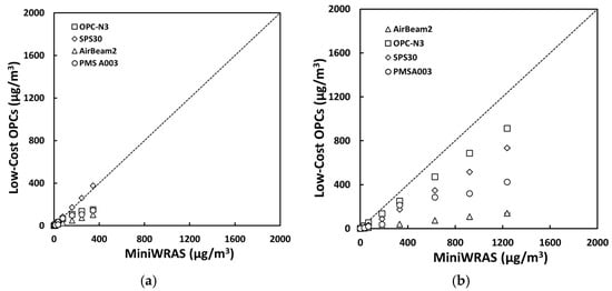 Data collected from the sensors were averaged over 1 min and time paired with the reference instrument using Matlab R2019B. Scatterplots for 5 min average mass concentrations of PM1, PM2.5, PM4, and PM10 were plotted against the reference instrument. The correction factor for the reference instrument was obtained by dividing the gravimetrically measured mass concentration (PM2.5 and PM4) by the mean of the reference instrument mass concentrations over the same period. After this point, we used PM2.5mc and PM4mc to denote the miniWRAS-corrected concentrations for environmental and occupational settings and PM2.5 and PM4 to denote the uncorrected concentrations for environmental and occupational settings, respectively. Finally, the performance of the low-cost sensors and pDR-1500 was examined for accuracy, bias, and precision under various conditions. The slope, intercept, and Pearson coefficient (r) were calculated using a linear regression model to measure the accuracy of the low-cost sensors compared to the reference instrument.