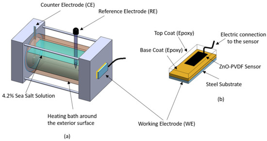 Metals have a tendency to corrode on exposure to the environment especially where there is high moisture content. The situation becomes worse in the case of submerged steel pipes exposed to saltwater. Organic coatings serve as a barrier between the metal substrate and the surrounding environment to reduce the transport of moisture, water, and ionic species to the metal substrate [1]. However, after being exposed to the corrosive environment for a long time, these organic coatings start degrading and cause metal corrosion. Corrosion sensors have been investigated using an embedded electrode or sensor placed in the coating to measure changes in the electrochemical properties [2,3,4,5]. Researchers have embedded platinum, gold, and nickel sensor layers at the metal–coating interface to measure the real-time electrochemical impedance [5,6,7,8,9,10,11]. A major drawback in such a system is the corrosion of the sensing element itself as it is also metallic. Moreover, cost becomes a concern for wide-area application and measurement of the corrosion response. To overcome these limitations, a low-cost nonconductive sensing material is highly desired in order to detect corrosion without being corroded. In our previous work, we have shown that a nonconductive ZnO-PVDF nanocomposite nonwoven textile, fabricated from the electrospinning method, could be used as an embedded sensor to sense corrosion under the organic coating after it was immersed into a sea salt solution [12]. The textile was found to offer two benefits. First, it performed well as a sensor and the impedance matched that of an external calibrated corrosion instrument. Second, the presence of the textile improved the corrosion performance of the coating by increasing the corrosion resistance. In this paper, we investigated the long-term reliability of the sensor through accelerated aging and the impact of the coating–glass transition on the sensor’s performance.