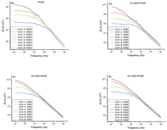 In order to determine the efficiency of the sensor in real-time monitoring, corrosion was induced through the thermal cycling method, which involved exposing the coating to alternating room temperature and higher temperature (35, 45, and 55 °C or (Tg −10 °C), (Tg −10 °C), and Tg) cycles to perform EIS testing using Configurations A and B. The Bode plot of the topcoat/basecoat system with the epoxy coating alone is shown in Figure 3, and those for the different sensor textiles are shown in Figure 4 associated with Configuration A and B, where the 25 °C data are related to cycle 2 (25M2) and the set temperature data are related to the second of the three cycles that the coating was subjected to (35M2, 45M2, and 55M2). At 25 °C (Tg −30 °C), the impedance values |Z| of PVDF, 1% ZnO-PVDF, 3% ZnO-PVDF, and 5% ZnO-PVDF fiber embedded samples were 1.53 GΩ, 6.55 GΩ, 9.24 GΩ, and 11.3 GΩ, respectively, indicating a sharp increase in corrosion resistance after adding ZnO into the fiber. This was due to the addition of hydrophobic ZnO to PVDF fiber, which increased the resistance and capacitance of the coating [25,27]. For reference, the epoxy alone has an impedance modulus of 0.078 GΩ, indicating textiles contribute substantially to improving the corrosion resistance in coatings.