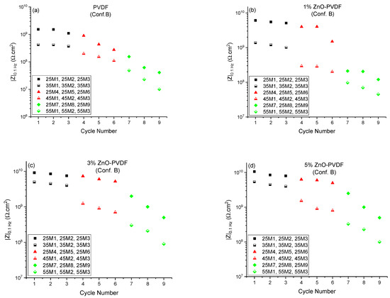 |Z|0.1 Hz values measured at room temperature and set temperatures as a function of thermal cycle number for (a) PVDF fiber, (b) 1% ZnO-PVDF fiber, (c) 3% ZnO-PVDF fiber, and (d) 5% ZnO-PVDF fiber. The 25M1 to 25M9 data are associated with |Z|0.1 Hz values measured at 25 °C of each cycle, while the 35MY, 45MY, and 55MY data are associated with set temperatures (35, 45, and 55 °C) where Y = 1, 2, and 3.