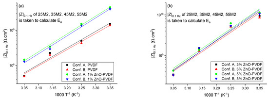 The low-frequency impedance modulus (|Z|0.1 Hz) as a function of 1/T for (a) PVDF and 1% ZnO-PVDF, and (b) 3% ZnO-PVDF and 5% ZnO-PVDF.