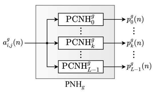 After that, the final value of each k-th component of the m-th image, , is obtained by summing all the k-th partial values provided as an output of each g-th PNH, . This sum is performed for each k-th component through an adder tree (), as represented in Figure 2. This tree has a depth equal to . At the end, the value of the components of the normalized histogram, , is obtained, according to Equation (3).