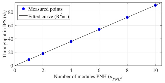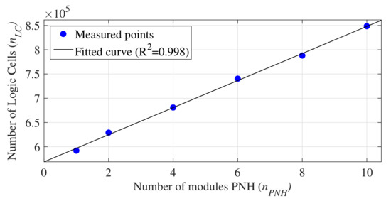 As can be observed in Table 4, the value of is directly proportional to and inversely proportional to and D. Thus, the more PNH modules employed in the implementation, the better the system performance. Figure 9 shows the curve obtained by linear regression that relates the values of and . The equation associated with this curve is expressed by