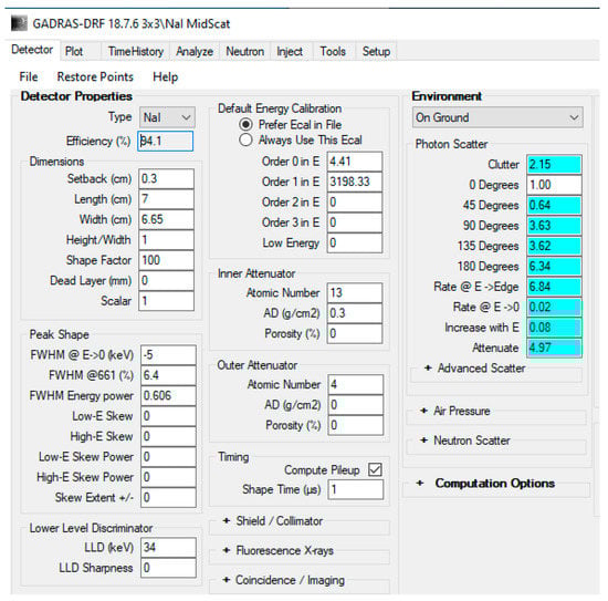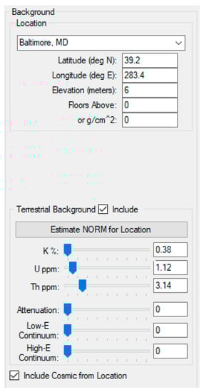 GADRAS Inject tool settings for generating background spectrum with NaI detector @ 122 cm, H = 56 cm (Baltimore, MD location is used, and terrestrial and cosmic are included).
