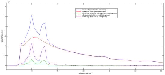Estimated source spectra (foreground-background) using the inject tool of GADRAS with background, using Plot tool alone and using the Inject tool with no background and no Poisson statistics for 238U, 10 uCi source with NaI detector @ 122 cm, H = 56 cm.