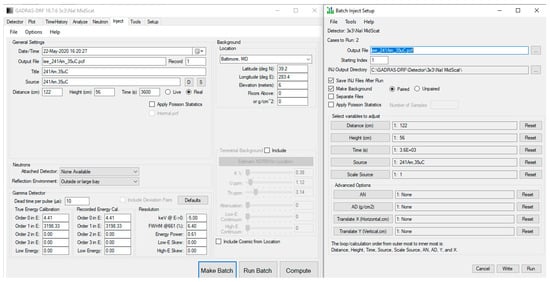 GADRAS Inject tool settings for generating individual radioactive source-only spectra with NaI detector @ 122 cm, H = 56 cm.
