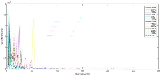 Gamma ray signatures of the individual radioactive materials generated with GADRAS (NaI detector @ 122 cm, H = 56 cm).