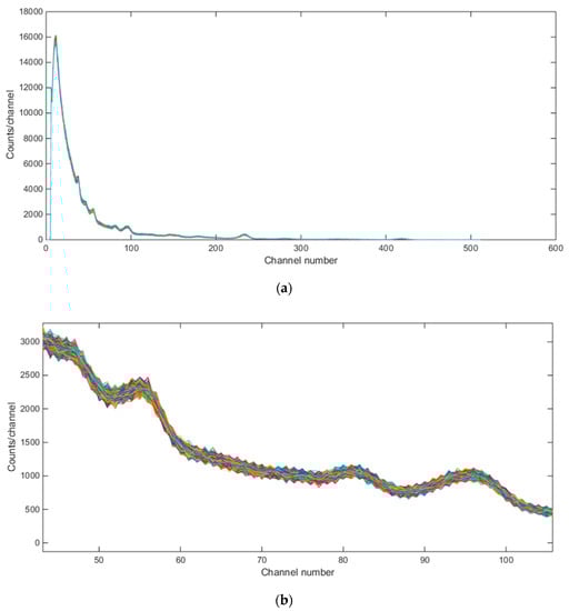 Emulated background gamma ray spectra (for Baltimore, MD) for 4290 separate simulations. (a) whole spectrum; (b) zoomed version.
