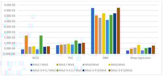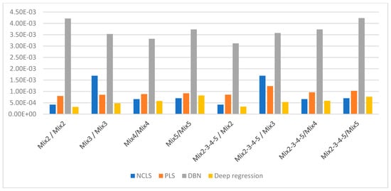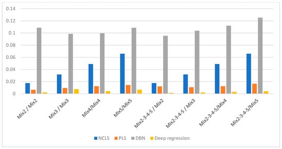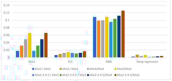 Average RMSE comparison using bar plots for “high-mixing-rate mixture” dataset with respect to method (Mixing-rate range used for synthesizing mixtures is: [0.25 3.00], Min: 0.25 Max: 3.00).