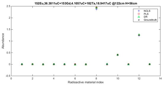 Three-source mixture example from low-mixing-rate dataset when foreground spectrum is used for mixing-rate estimation (RMSE values: NCLS: 0.0260, PLS: 0.0016, DR: 0.0007).