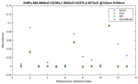 Three-source mixture mixing-rate estimation example (source = background − subtracted foreground) from high mixing-rate dataset, (RMSE values: NCLS: 0.0181, PLS: 0.0090, DR: 0.0066).