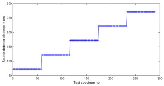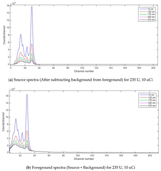 Foreground and source spectra for 235 U, 10 uCi when source-to-detector distance varies (NaI detector where detector-to-ground distance is set to 56 cm and dwell time for detector is 3600 s).