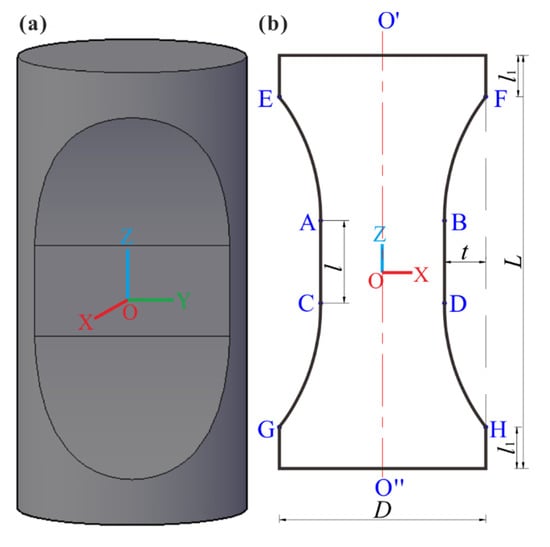 A new flattened cylinder specimen is proposed for DTT, as shown in Figure 1. It was made by a standard cylinder (φ50 mm × 100 mm) cutting off two symmetric concaves (EACG and FBDH) symmetric to the arbitrary diameter symmetric plane O′O″. One concave (EACG or FBDH) was composed of two symmetrical arc surfaces EA and CG (with vertical distance l1 from top and bottom ends of the specimen) for reducing the stress concentration at the ends of the specimen, and one flat surface AC (with length l and cutting thickness t) in the middle areas for obtaining a uniform stress distribution.