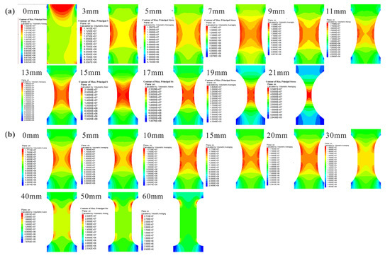Maximum principal stress contours of the flattened cylinder specimens in yoz section plane (a) with different cutting thicknesses t (t = 0, 3, 5, 7, 9, 11, 13, 15, 17, 19, 21 mm) for a given flat length l (l = 10 mm) (b) with different flat lengths l (l = 0, 5, 10, 15, 20, 30, 40, 50, 60 mm) for a given cutting thickness t (t = 10 mm).