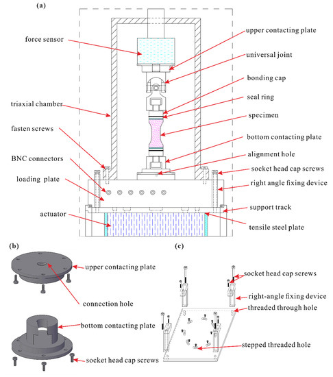A special clamp device needs to be designed for DTT of the new flattened cylinder specimen by MTS815 testing machine (Figure 3a). It consists of upper and bottom contacting plates (Figure 3b), a tensile steel plate (Figure 3c), and a universal joint. The specimen is bonded to two bonding caps. The upper contacting plates and the universal joint transmit the force applied to the top end of the specimen to the force sensor located at the top of the specimen, while the universal joint can adjust the position of the specimen for alignment. In order to apply tensile stress to the lower end of the specimen by the actuator of the MTS518 testing machine, the bottom connecting plate, the loading plate, and the tensile steel plate are connected to the actuator by socket head cap screws and a right-angle fixing device to form a body, so that the specimen can be moved downward simultaneously with the actuator.