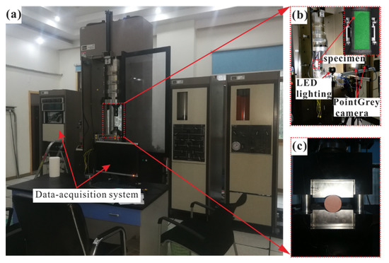 Test machine and loading setups: (a) MTS815 test system, (b) the direct tensile test with digital image correlation, (c) Brazilian test through MTS tension fixture.