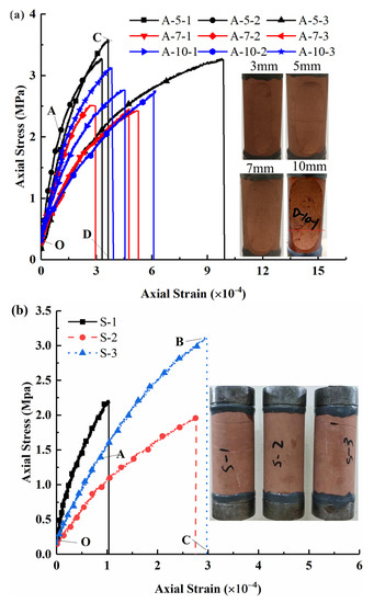 Figure 5 shows the stress–strain curves of specimens in different tensile tests. For the flattened cylinder specimens (Figure 5a, except for the invalid specimens A-3-1, A-3-2, and A-3-3 due to breaking at the bonding surface of the adhesive and specimen) and the intact cylinder specimens (Figure 5b) in DTT, all the strain–stress curves (t = 5 mm, 7 mm, 10 mm) have similar characteristics. That is, they can be divided into three stages—linear elastic deformation stage (O-A), non-linear deformation stage (A-B), and failure stage (B-C)—without any compaction section. For the Brazil discs in BT (Figure 5c), the strain–stress curves are typically S-shaped and can be divided into three stages (O-A-B-C): the compaction stage (O-A), linear elastic stage (A-B), and the failure stage (B-C).