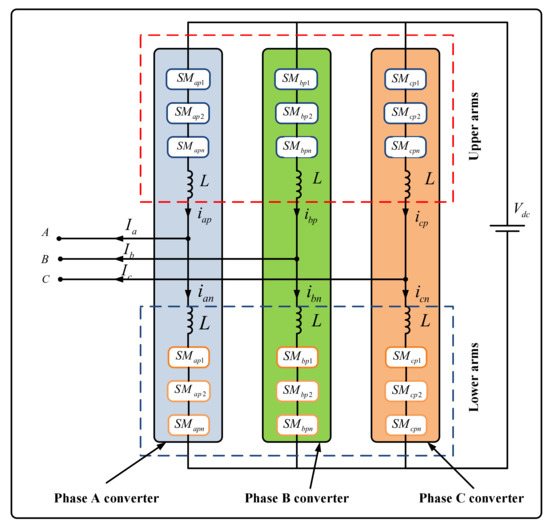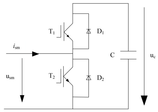 A typical structure of a three-phase MMC consists of six arms as shown in Figure 1 [33]. Each arm consists of one inductor () and several identical SMs. Each SM involves one DC storage capacitor () and a half-bridge, which is composed of two IGBTs (i.e., and ) and two diodes ( and ). The circuit of SM is shown in Figure 2.