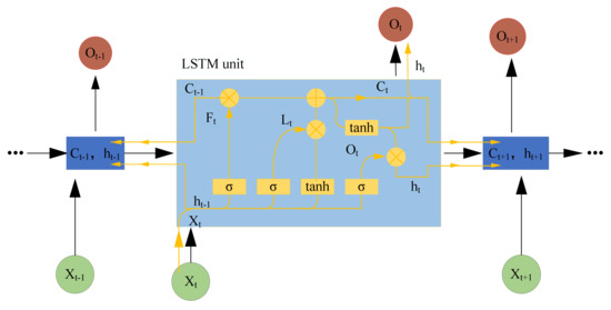 Recurrent neural network (RNN) has become one of the important subfields of deep learning, which has been widely used in the fields of speech recognition [39], rotating machine fault detection and classification [40], medical image segmentation [41], and natural language processing [42]. Figure 3 shows the RNN structure. In order to avoid the problems of gradient vanishing or exploding, a long and short-term memory (LSTM) neural network, which involves creating a memory cell [43], is employed. Figure 4 shows the LSTM structure which illustrates the flow of data at time step t.