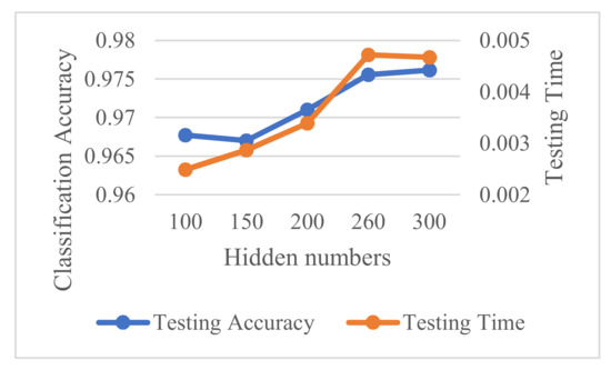 The accuracy and computation time at different hidden layer sizes are depicted in Figure 5, when the maximum number of epochs set to 50 and the mini-batch size is set to 7. It can be shown that as the hidden layer size raises from 100 to 300, the computation time has a distinct peak with the hidden layer size set to 260 while the accuracy curve always rises as the layer size get bigger. In theory, the abscissa of the focus of the two lines should be the most optimal Hidden numbers. However, in the case of a small difference in time consumption, we are more concerned about the classification accuracy. Therefore, we select the hidden layer size as 300 by considering accuracy and computation time.