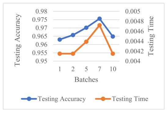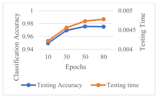 The results for training data and testing data are shown in Figure 8. STD in Figure 8 means the standard deviation, which is a measure that is used to quantify the amount of variation or dispersion of data values. It is observed that, with the rise of testing data proportion, classification accuracy for training data is steady (except a little dip at the testing data proportion of 0.8) and classification accuracy for testing data declines. The maximum mean accuracy of the testing dataset is 98.4% at 0.1 testing data proportion and the minimum average accuracy is 92.6% at 0.9 testing data proportion. The standard deviation of the classification accuracy for the training dataset increases with the increasing testing data proportion. However, for the testing dataset, the standard deviation of the classification accuracy at the ends of the testing data proportion is greater than around the middle of the testing data proportion. Moreover, the standard deviation of the classification accuracy for the training data set is less than that for the testing data set at all data proportions.
