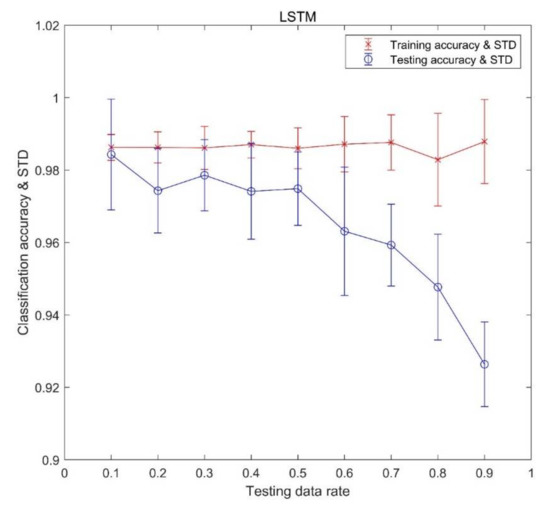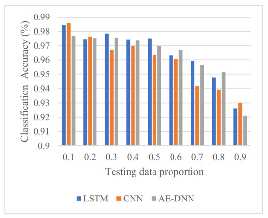 Compared to CNN and AE-based DNN from Figure 10, it is observed that the proposed method (LSTM) offers higher classification accuracy at the testing data proportion 0.3, 0.4, 0.5, and 0.7. When the testing data proportion is 0.1, 0.2, and 0.9, which are located at the ends, CNN has better classification accuracy than LSTM and AE-based DNN.