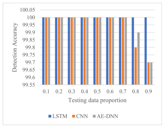 Compared to CNN and AE-based DNN from Figure 9, it is observed that in terms of detection accuracy, the proposed method (LSTM) behaves outstandingly well at each testing data proportion. When the testing data proportion ranges from 0.1 to 0.7, these deep learning methods can detect faults perfectly.