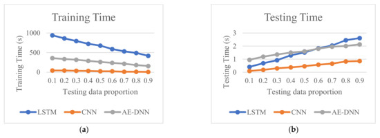 Figure 11 shows the training time spent and testing time spent of the three methods. We can see that at each proportion, the LSTM method spends more training time than other methods and spends more testing time than CNN. We also can see that LSTM spends less testing time than AE-based DNN at the testing data proportions 0.1–0.6.