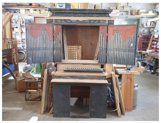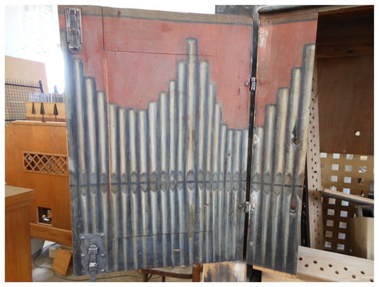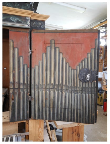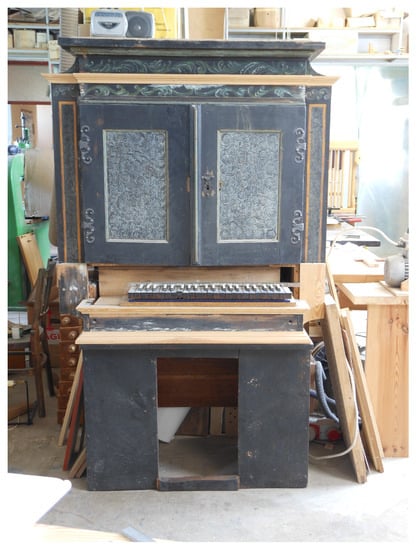The chest organ in question dates back to the 17th century. Inscriptions with dates can be found in its windchest (the mechanism that directs compressed air into the pipes). Those include the discernible dates of the instrument’s repairs (1788 and 1829). One can also find an inscription from 1692, which was probably written by the organ builder. What remains of the instrument is its case, featuring an original picture of the pipes, the windchest, stop knobs (controls that turn the required voices on and off), some of the wind ducts carrying air from the bellows compartment to the windchest, and a few keys. Figure 1, Figure 2, Figure 3 and Figure 4 show the instrument as it looked before renovation.