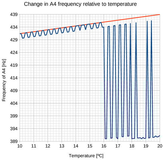 The methods discussed in Section 3 and Section 4 required further testing on other sets of data in order to verify the returned results. To this end, files with air column lengths calculated for several temperaments, such as equal, Pietro Aaron’s, Valotti’s and Tuners guide well #3 [], were used. The tests made it possible to specify the minimum amount of data necessary to find the required temperament, as well as to define the relationships needed for the correct establishment of the sound A4 frequency for different temperaments.
