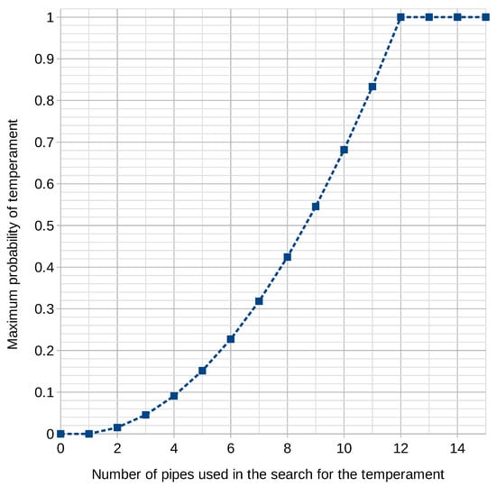 The maximum probability of finding the temperament relative to the number of pipes used in the search for the required temperament.