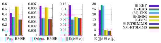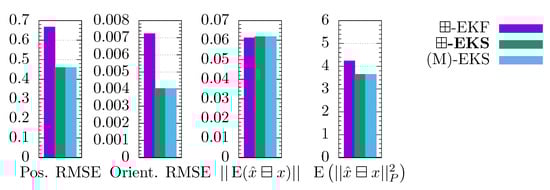 In the ⊞-EKS formula, the centered transform is dominant as it encloses the whole Equation (50). Thus, the ⊞-EKS reduces the covariance marginally in comparison with the (M)-EKS. Since the covariance is already too small in the simulation, the ⊞-EKS is slightly less consistent. Otherwise, if the covariances are too high, this effect would yield more consistent results. Thus, this is neither a clear performance degradation nor an improvement.