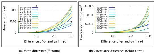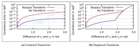 The error graphs of the centered and displaced transform clearly differ, which justifies the distinction of the two transform types. The error of the displaced transform (see Figure 5b) is, for high differences of the references, several orders of magnitudes higher than the base covariance. The reason is that wrap-around issues arise, since we approach the classic singularity of quaternions close to angles of . Note that closeness depends on the chosen covariance. With a higher covariance, the wrap-around issues occur earlier. Since the linear transformation evaluates a single point, the wrap-around is not incorporated. However, such extreme differences of the references do not usually occur during estimation.
