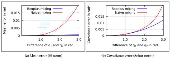 Similarly, the effect of the ⊞-mixing on the covariance is small (see Figure 3b). Hence, the two mixing methods differ only for high differences of the mixed quaternions. In the presented simulation example, the angular differences are small, wherefore the mixing methods have equal results.