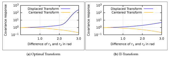 We compare the conducted linear approximation of the reference transform with a numerically computed optimum, where we distinguish between displaced and centered transforms (see Figure 5). For further comparison, we add the error of no transformation, which shows the behavior of the (M)-EKS. The covariance of the Gaussians has been set to .