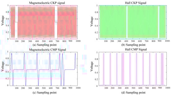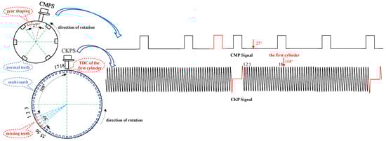 13]. The CKP signal and the CMP signal are a set of synchronous signals; the crankshaft turns two times, and the camshaft turns once. There are usually several missing teeth on the signal panel of the crankshaft to distinguish the number of crankshaft turns. In addition to the gear shaping, the camshaft gear slots are equally spaced. The ECU collects engine speed and cylinder information through the crankshaft position sensor (CKPS) and camshaft position sensor (CMPS) [
