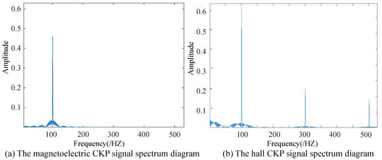 Figure 5, the spectrum of magnetoelectric CKP signals and Hall CKP signals are analyzed using discrete Fourier transform (DFT). The oscilloscope is used to collect 1000 points within 0.1 s, so it can be concluded that the value of Fs is 10,000, and the point