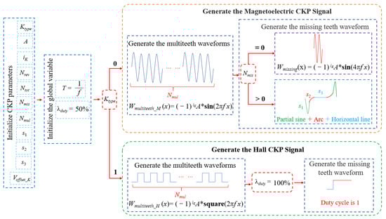 20]. The signal generator design is the essential step in the HIL process. The ECU provides for the precise control of the actuator through a series of sensors to obtain real-time operating data of the engine. The CKP and CMP signals are the most crucial input signals in the engine control system, as they are required for fuel injection and ignition timing regulation. In the relevant literature, the existing signal generation is mainly carried out considering two aspects: Single chip microcomputer (SCM) hardware simulation and virtual instrument software simulation.