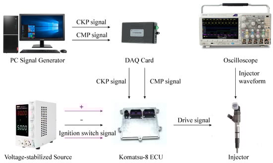The experimental environment was set up. The ESCP-SM was realized based on virtual instrument technology and provided an excitation signal for the ECU through the data acquisition (DAQ) card. The voltage-stabilized source supplied the ECU with power and the ignition switch signal. The experimental environment is shown in
