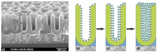 SEM image of low profile NAA matrix prepared for SILAR deposition of composite films (a); schematic representation of ionic deposition of tin-tungsten oxides into the pores of the NAA (b–d).