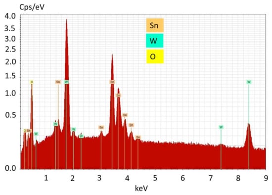 At the first stage of the present research work, the influence of the chemical nature of anionic and cationic precursors used in the formation of thin film structures, and the growth rate and morphology of the obtained functional coatings were studied. The EDX spectrum of the thin film structures of the SnxWOy∙nH2O is shown in the Figure 2.