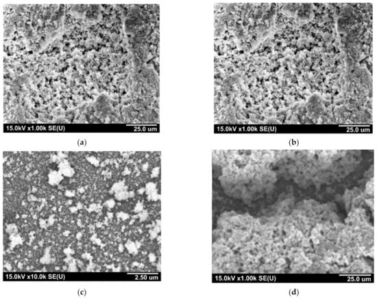 SEM images of the SnxWOy∙nH2O films obtained using different precursors: (a) SnCl2; (b–d) SnF2; (a–c) Na2WO4; and (d) (NH4)2O·WO3.